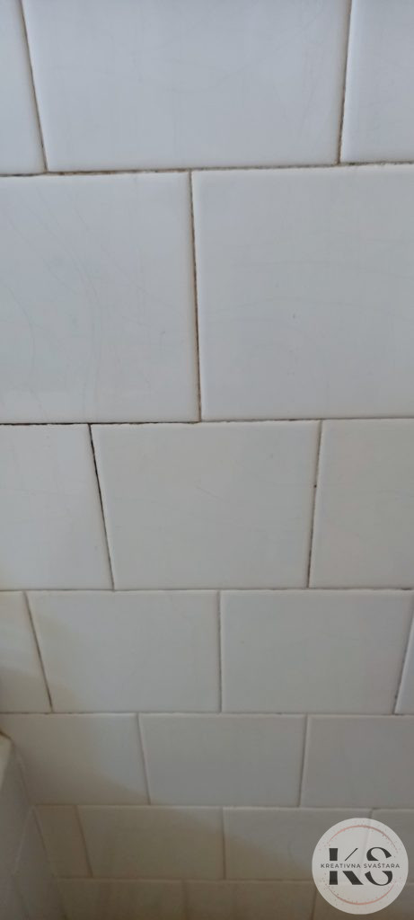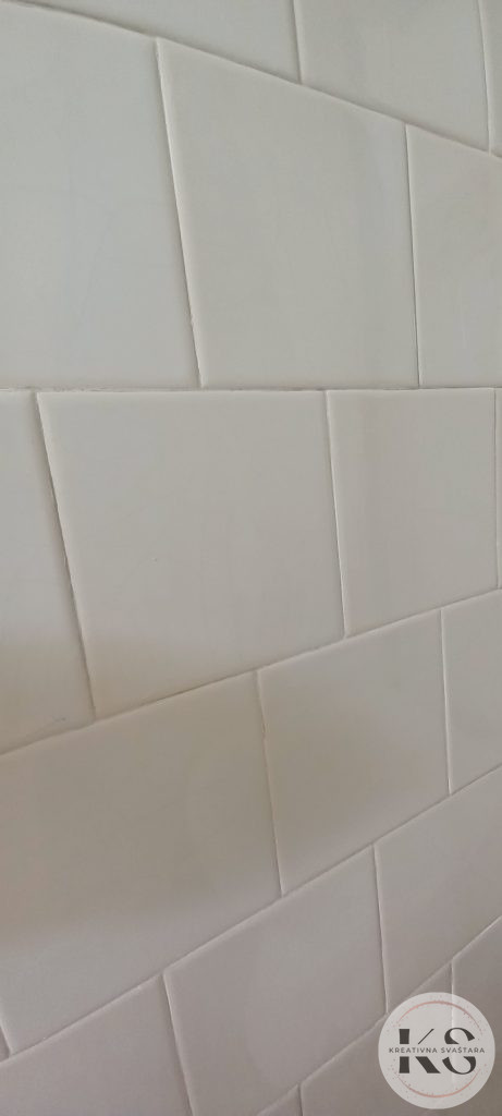 tj. fuga na pločicama. Pločice u kupaoni nisu fugirane klasičnom fugir masom nego ljepilom za pločice pa je proces bojanja “fuga” bio malo teži.