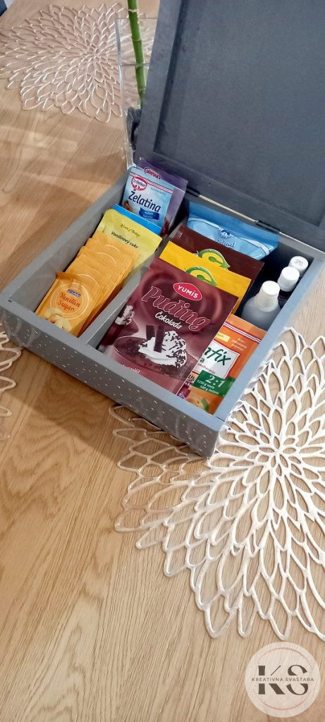 Za kraj….punjenje kutije potrepštinama za kolače. Uspjela sam staviti i arome za kolače, puding, vanilin šećer….